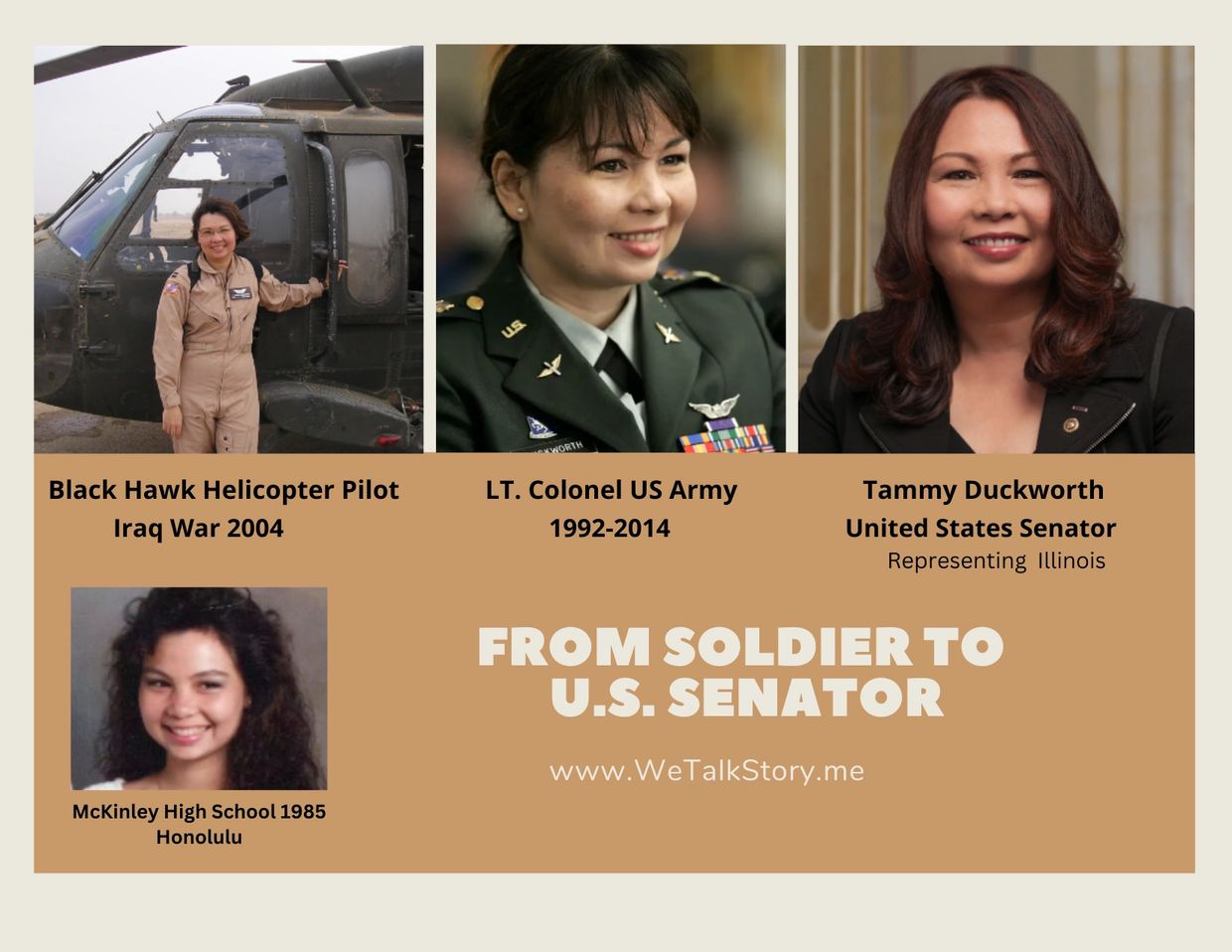 She graduated from McKinley High School in 1985 and attended the University of Hawaii. As an ROTC student she earned a Master in International Affairs at George Washington University and was working toward a Ph.D. when she was deployed to Iraq in 2004. Duckworth was part of the first group of women in combat. She was injured when her helicopter was attacked and she lost both of her legs.